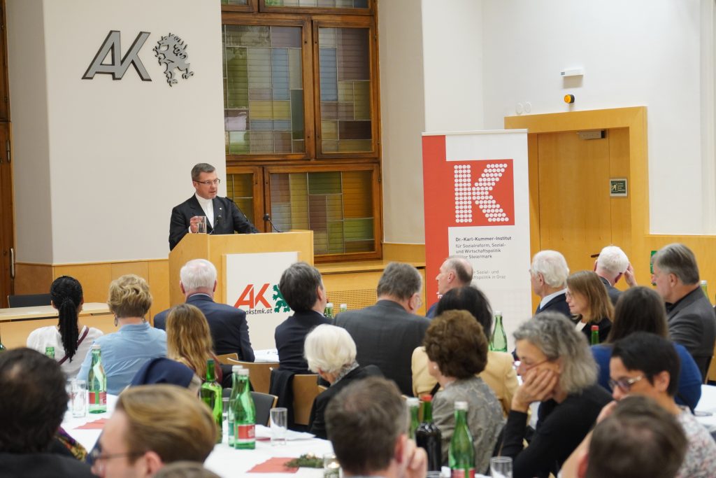 Das diesjährige 45. Adventgespräch des Dr.-Karl-Kummer-Instituts für Sozialreform, Sozial- und Wirtschaftspolitik in der Steiermark (seit 1980 rund um den 8. Dezember veranstaltet) fand am Sonntag, dem 8. Dezember 2025 im vollbesetzten Kleinen Saal der Arbeiterkammer statt. Der Obmann des Instituts Univ.-Prof. Dr. Klaus Poier erinnerte in seiner Begrüßung an den am 13. Mai des Jahres verstorbenen Gründungsobmann und Ehrenpräsidenten LH-Stv. a.D. Prof. Kurt Jungwirth, den er als inspirierenden Intellektuellen und Visionär, als weltoffenen, liberalen Katholiken und hochgeschätzten Mentor würdigte, dem das Dr.-Karl-Kummer-Institut über das von ihm initiierte erfolgreiche Format der Adventgespräche hinaus unzählige geistige Impulse und bereichernde Begegnungen verdankt. Den Festvortrag hielt Weihbischof Mag. Johannes Freitag, MBA zum Thema „Advent als Aufbruch: Christlich-soziale Orientierung in einer pluralen Gesellschaft“.